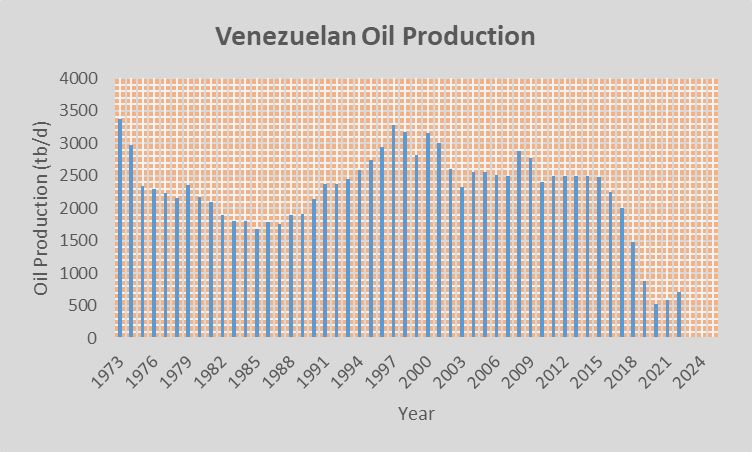 委内瑞拉1973年来的石油产量,图片来源:美国能源信息署